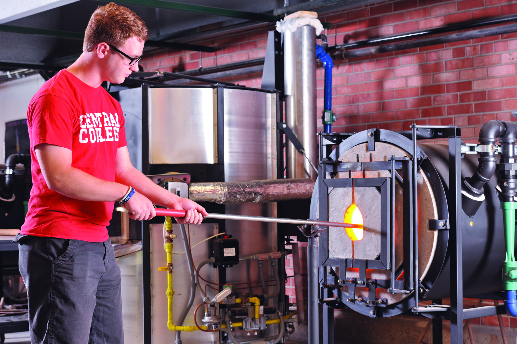 In the Lubbers Center for the Visual Arts, there’s a back corner that seems to belong on another planet. For one, it’s usually about 110 degrees Fahrenheit, an atmosphere more suited to Venus than Earth. Figures in dark glasses stick steel rods into glowing molten holes. It would be a little frightening if the final products weren’t so breathtaking. There’s nothing nefarious going on here—Central students are creating art.