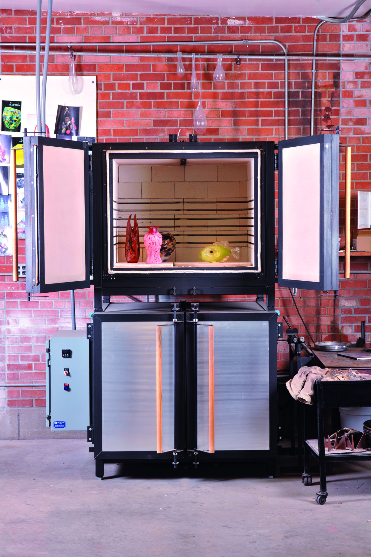The equipment had to be ordered a year in advance, from Wet Dog Glass in Star, N.C. They make all their equipment by hand and fit each unit with a self-regulating computer. These maintain an even temperature, so the glory holes won’t cool down when you open the doors. The new equipment is also more energy-efficient and heats the glass faster.