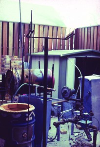 By the next fall, 10 students had joined the class. In a week, they built equipment out of scrap materials found behind the warehouse, like plumbing pipes, rusty angle iron, scrap tin, an old park bench and a garden hose. “This was really, really crude,” says Vruwink. “But a lot of glassblowing being done around the country then was in a fairly crude mode.”