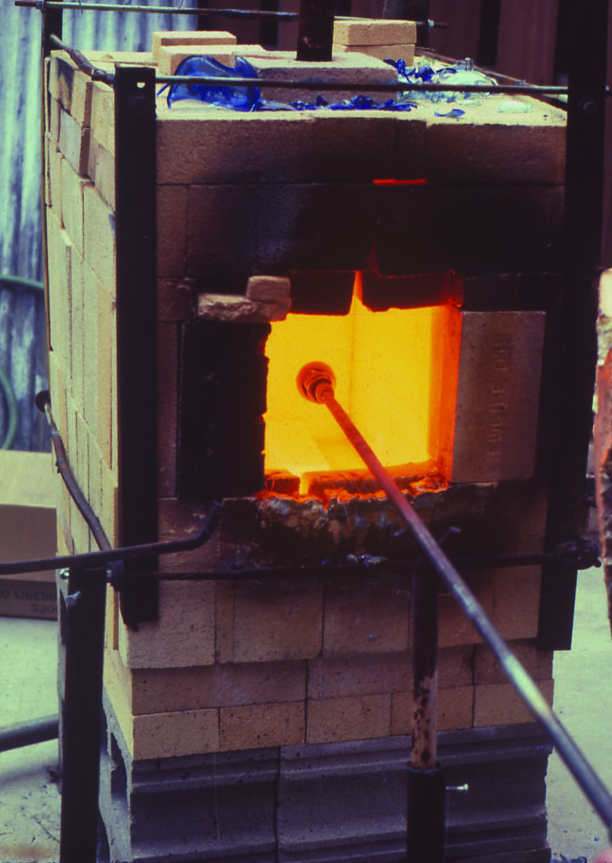 After the bubble is complete, the object is transferred to a punty, or solid rod. At this point, the artist may need to heat the glass again to keep it malleable. This is done in the glory hole, which is also set at 2100 degrees. Color can be added using broken-down or powdered glass. Then the piece is placed in the annealer, which cools down from 940 degrees over a period of 16 hours.