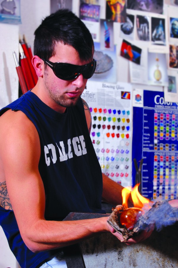Roberts works hard to make sure those things don’t happen in his studio, and his students work to perfect the art, even though they’re starting from scratch. “That’s what’s so good about glass: practice definitely makes perfect,” says Israel Miller, a senior political science major who took glassblowing last year.